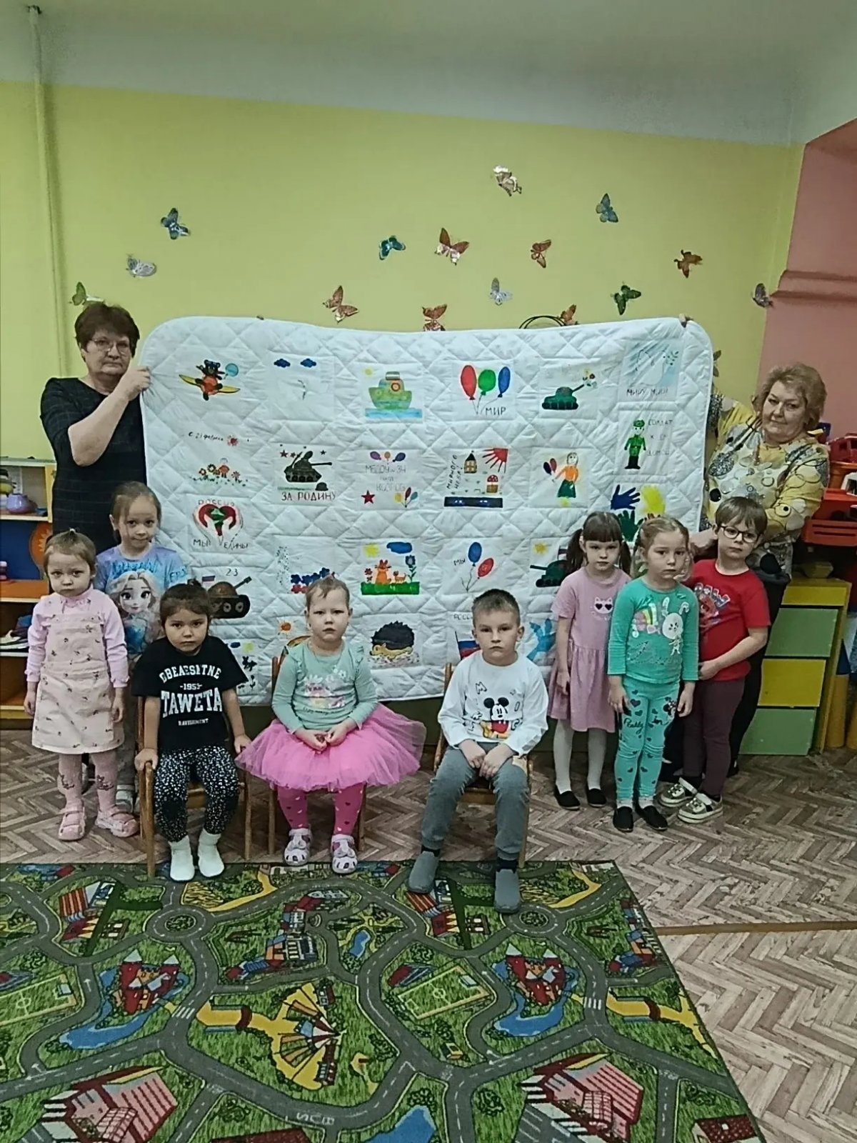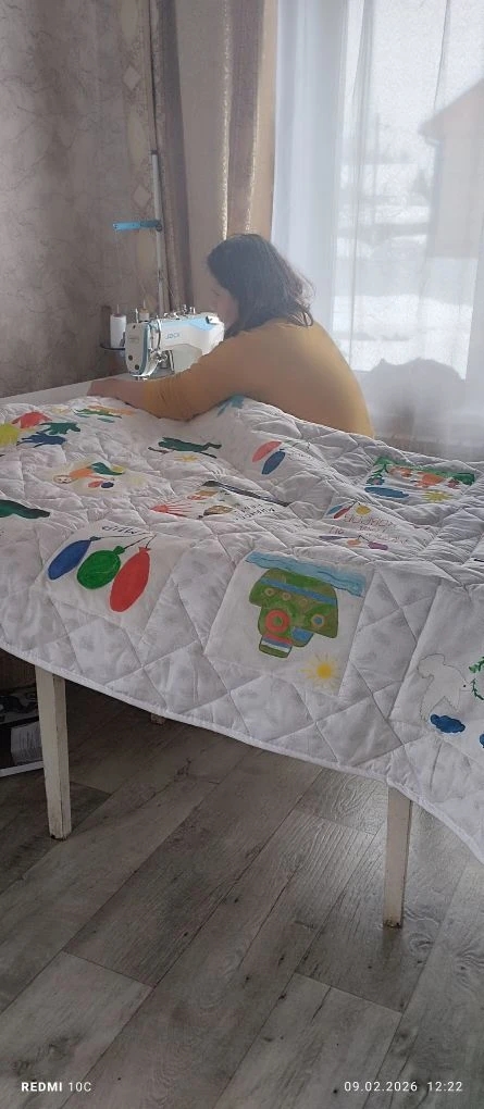 Наш детский сад стал участником патриотической акции «Лоскутное одеяло Победы», в которой дети, родители и педагоги совместными усилиями создали уникальное художественное полотно из красочных детских рисунков. Получившееся уютное одеяло — это не просто элемент декора, а символ глубокой поддержки и признательности нашим доблестным солдатам, стоящим на страже мира и спокойствия нашей Родины.